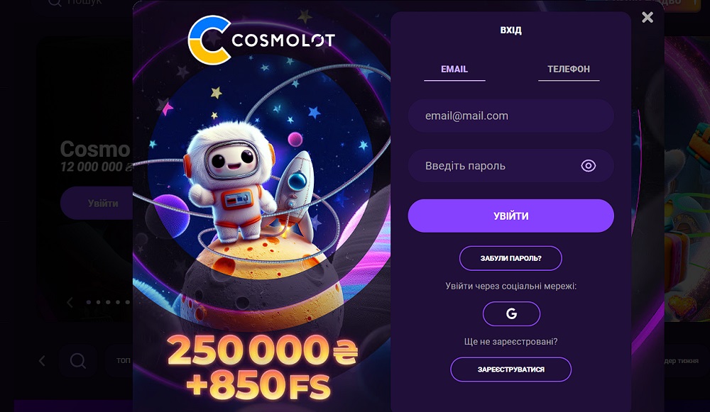 Перейдіть на головну сторінку сайту Космолот або відкрийте мобільну версію. Натисніть кнопку реєстрації та виберіть спосіб створення акаунта. Реєстрація доступна через електронну пошту або номер телефону.